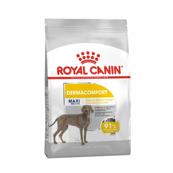 غذای سگ بالع نژاد بزرگ با پوست حساس یا Maxi Dermacomfort مکسی درماکامفورت رویال کنین از سن 15 ماهگی قابل استفاده بوده و دارای تاثیر اثبات شده است.