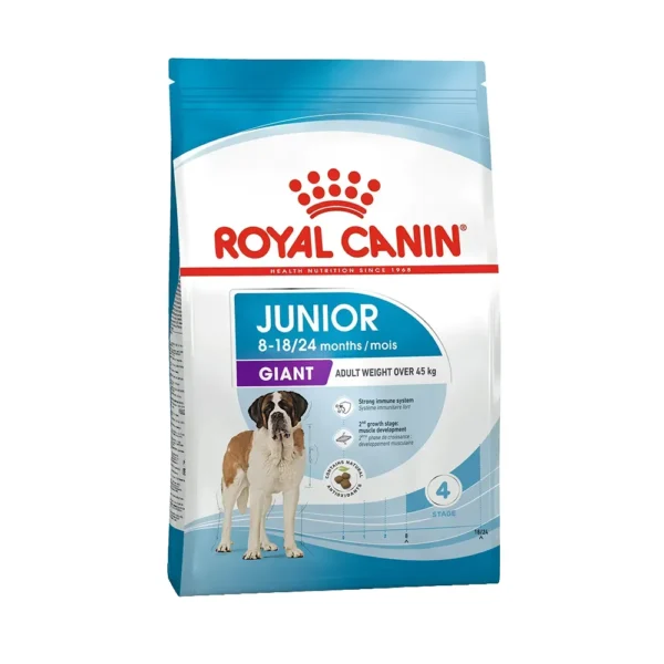 غذای سگ جوان خیلی بزرگ یا Giant Junior جاینت جونیور رویال کنین برای سنین 8 تا 18 یا 24 ماهگی نژادهای با وزن بالغ بالای 45 کیلوگرم مناسب است.