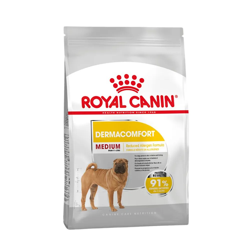 غذای سگ بالغ نژاد متوسط با پوست حساس یا Medium Dermacomfort مدیوم درماکامفورت رویال کنین حاوی اسیدهای چرب ضروری امگا 3 و 6 و پروتئین های با کیفیت است.
