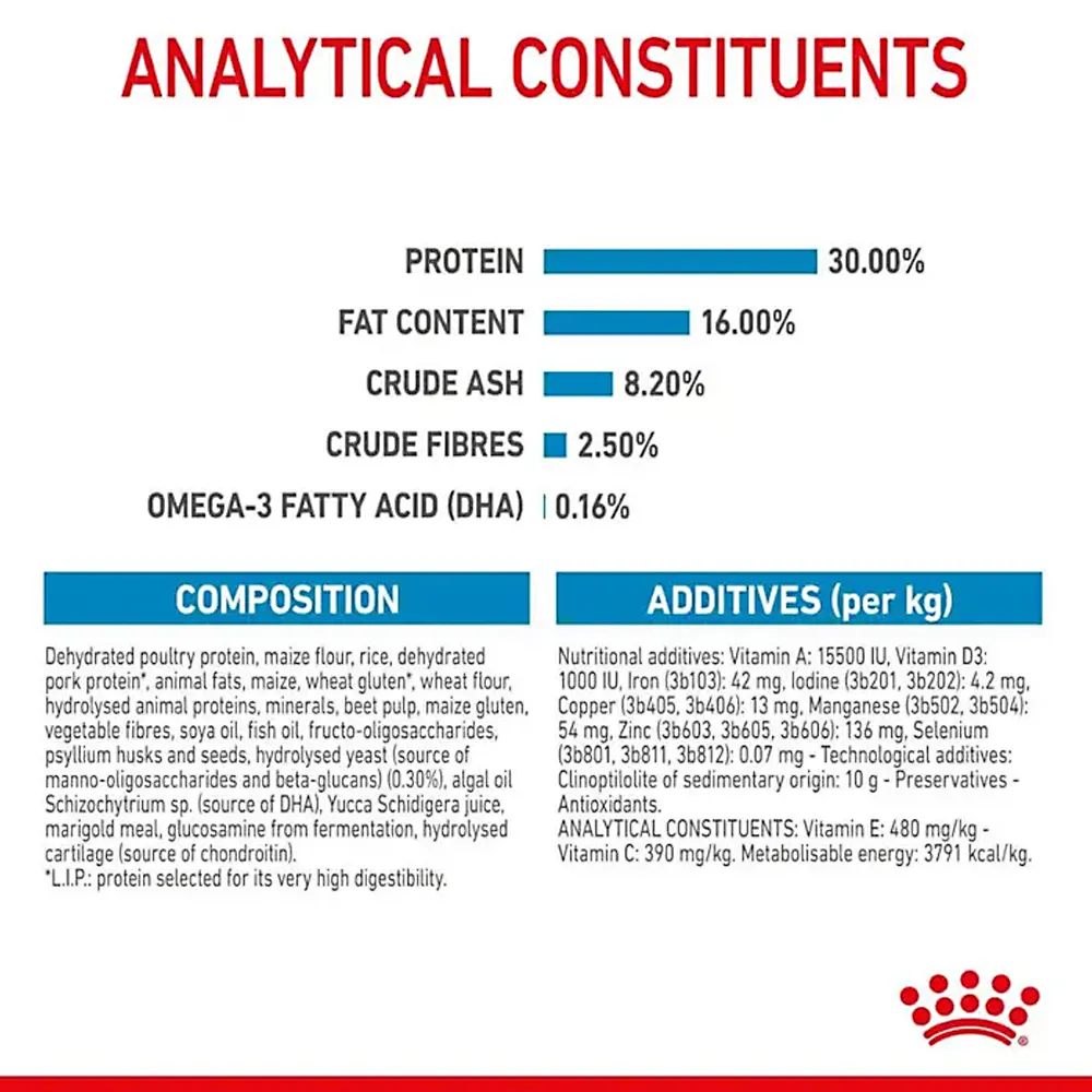 پروتئین مرغ خشک شده، برنج، آرد ذرت، پروتئین گیاهی ایزوله، چربی های حیوانی، ذرت، آرد گندم، پروتئین های حیوانی هیدرولیز شده، تفاله چغندر، گلوتن ذرت، مواد معدنی، الیاف گیاهی، روغن سویا، روغن ماهی، فروکتو الیگو ساکاریدها، پوسته و دانه پسیلیوم، مخمر هیدرولیز شده (منبع الیگو ساکاریدها)، عصاره مخمرها، عصاره گل همیشه بهار (منبع لوتئین)، سخت پوستان هیدرولیز شده (منبع گلوکزامین)، غضروف هیدرولیز شده، ویتامین ها، عصاره یوکا، مواد نگهدارنده، آنتی اکسیدان ها.