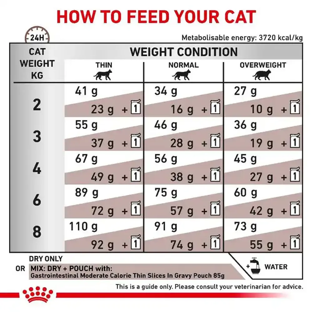 غذای درمان مشکلات گوارشی با کالری متوسط یا Moderate Calorie گاسترو اینتستینال مدریت کالری رویال کنین برای گربه های بالغ مناسب است.