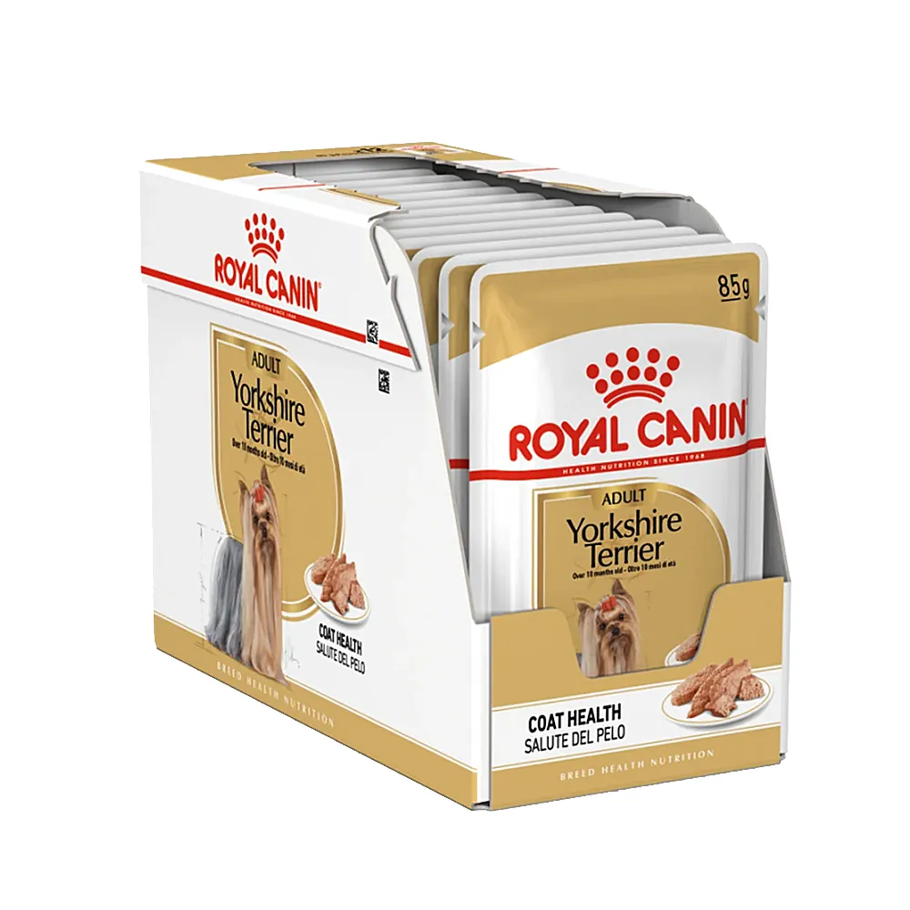 غذای پوچ یوکشایر بالغ Yorkshire Wet رویال کنین برای سگ های این نژاد از سن 10 ماهگی قابل استفاده است. این محصول پوست و مو را تقویت می کند.