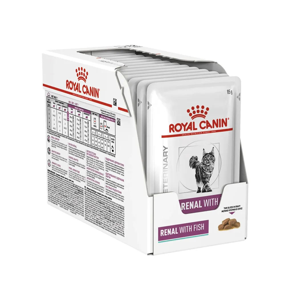 پوچ گربه با بیماری کلیوی طعم ماهی یا Renal Wet رنال فیش رویال کنین حاوی میزان فسفر پایین است که به سلامت سیستم ادراری کمک می کند.